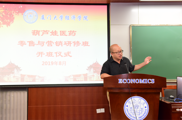 在开班仪式上,廖景峰主任首先代表厦门大学经济学院热烈欢迎球信网医药零售与营销研修班的学员到厦大学习,并就厦门大学及经济学院的相关情况进行了介绍。他说,球信网学员走进厦大就是厦大的校友,希望未来的日子能够关心、支持母校的发展,多提宝贵意见,同时他也祝大家在厦大学习期间学有所成、学有所获。